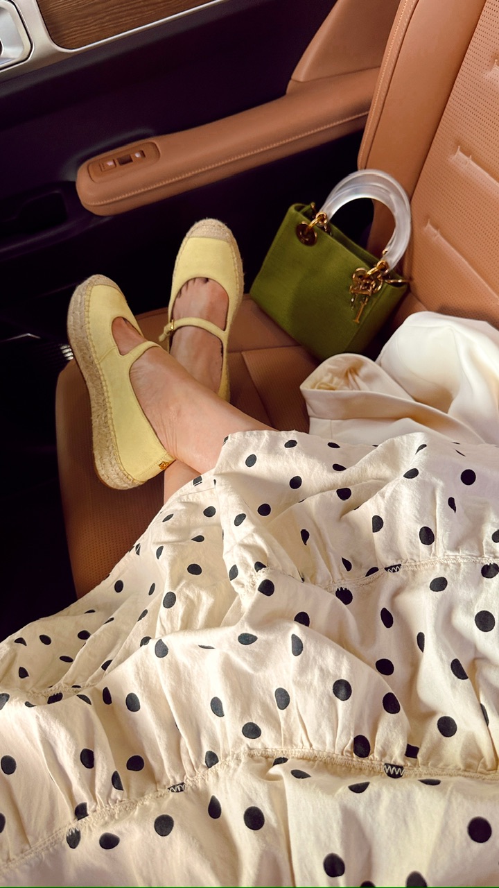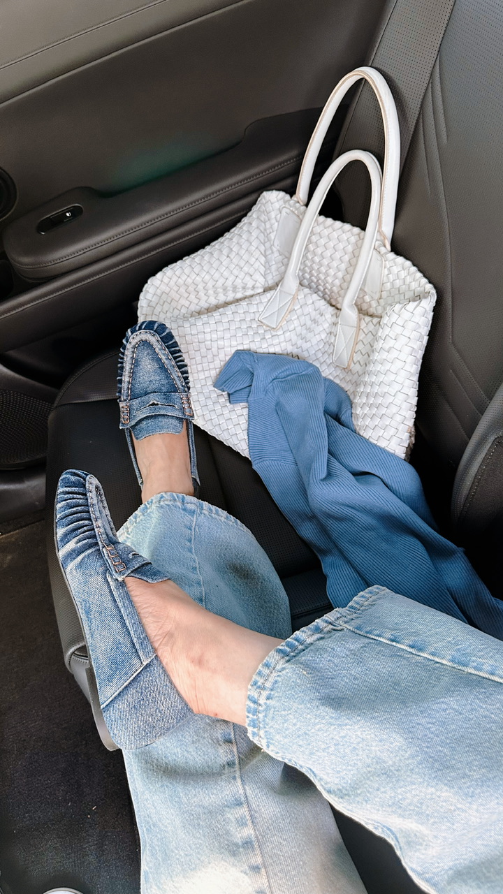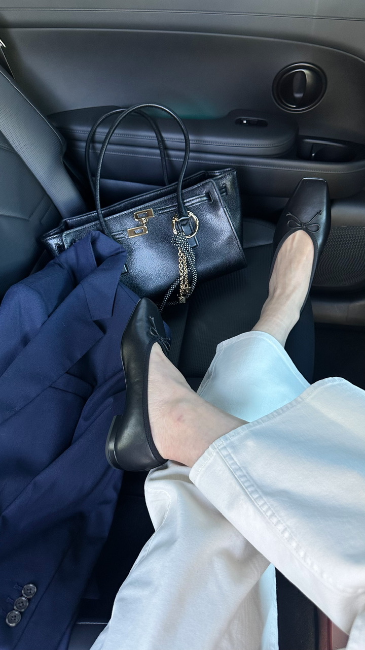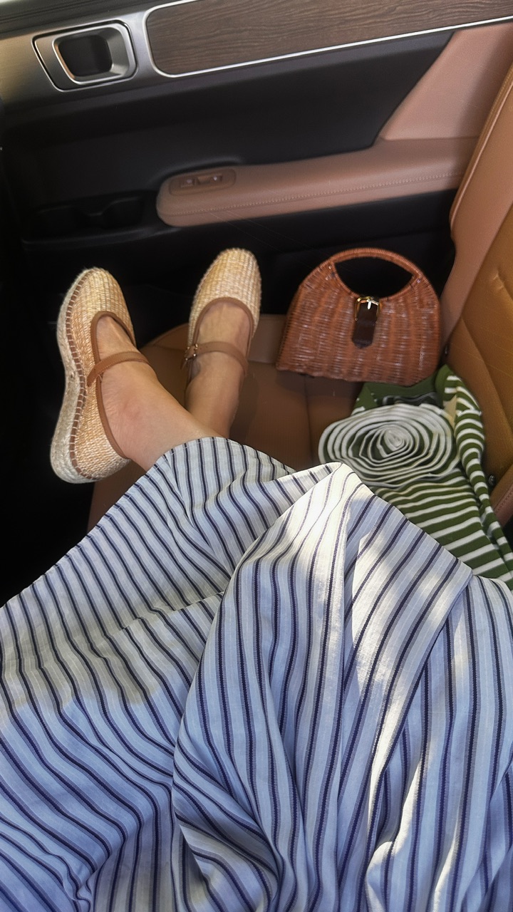 There’s something quietly romantic about getting ready from the backseat of a car—sunlight filtering through the window, a tote beside you, shoes tucked at your feet, and the day unfolding just ahead. It’s not rushed, not overly planned… just a moment of intention before stepping out.