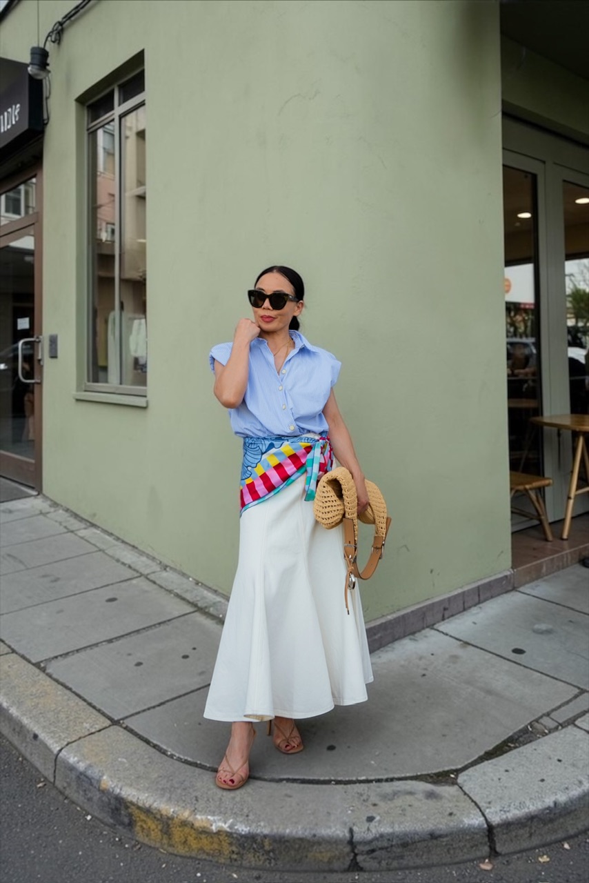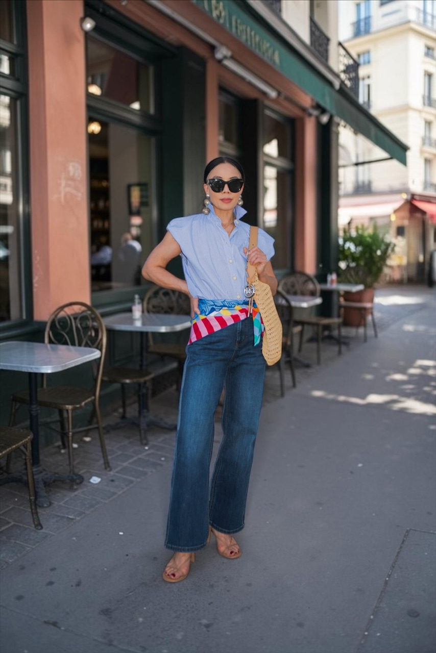 Using a silk scarf as a belt adds movement, color, and just the right amount of personality. It feels creative, slightly unexpected, and very “you.”